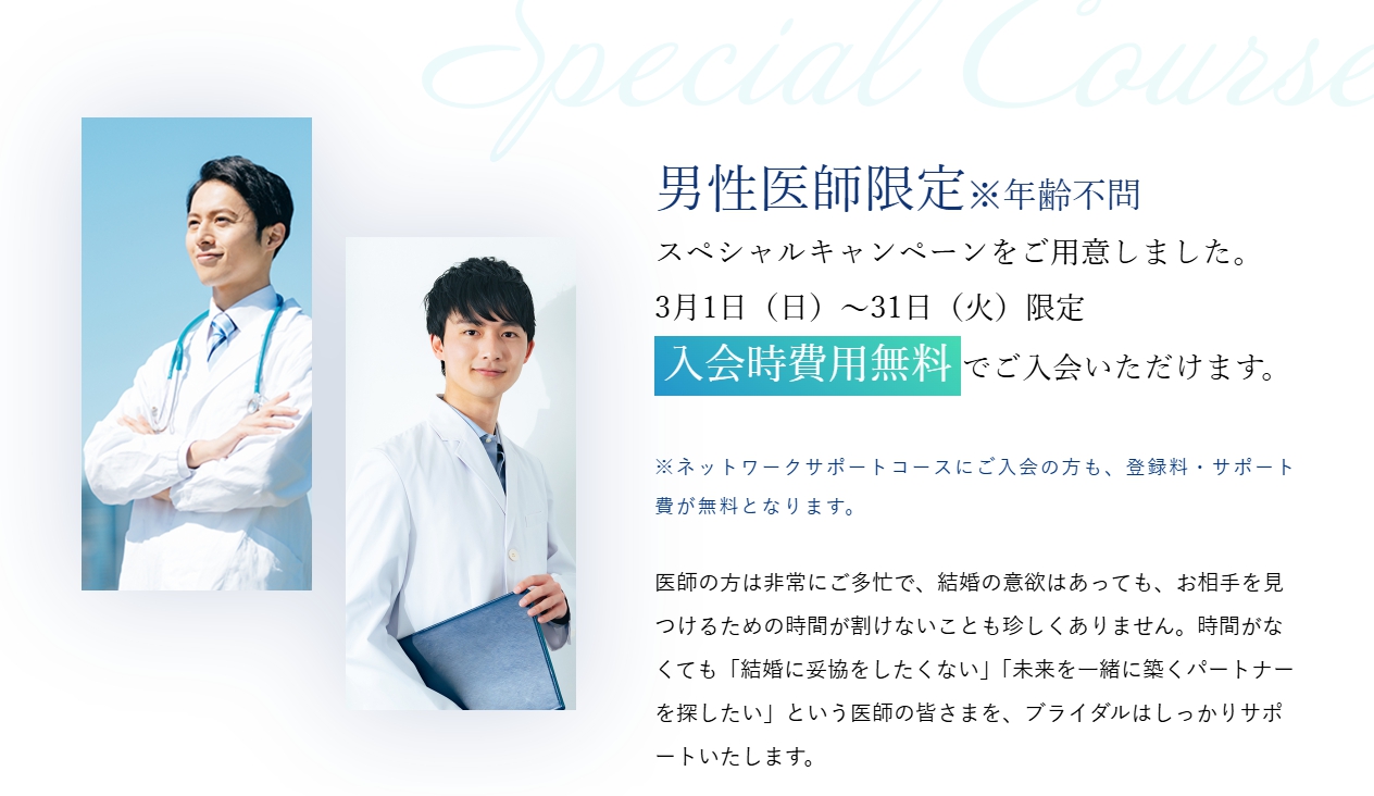 ブライダルでは、2月に全年齢の男性医師に向けたキャンペーンを実施いたしました。こちらのキャンペーンが大変ご好評をいただきましたので、3月も期間延長して実施させていただきます。男性限定で、入会時に必要な登録料¥33,000・会員サポート費¥66,000・月会費¥165,000がすべて無料!これを機会にぜひ、ブライダルの婚活サービスをご体験ください。